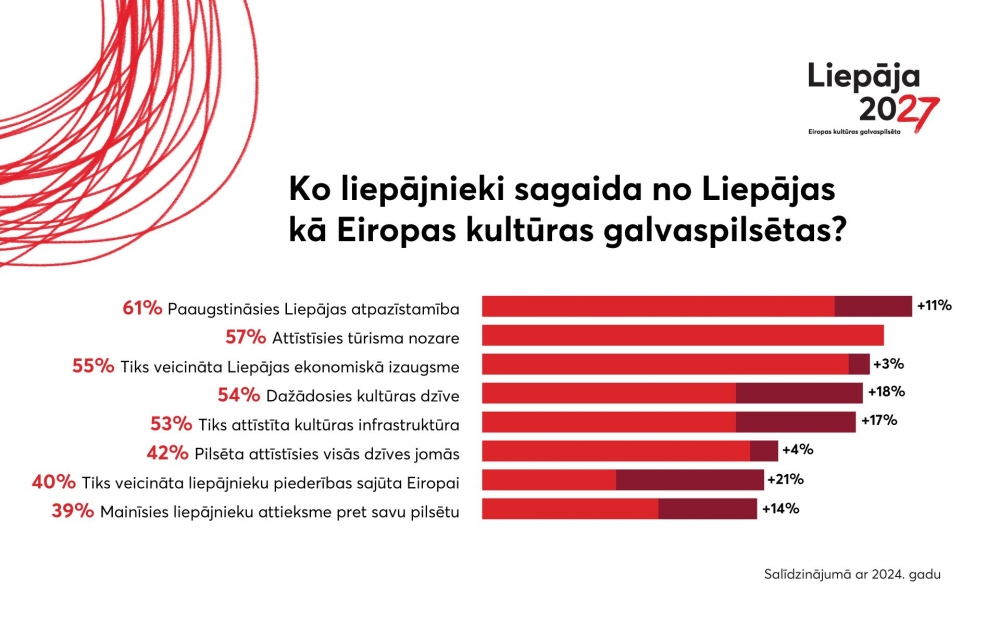 Pozitīvu tendenci iezīmē pieaugošie rādītāji par to, ko liepājnieki sagaida no Liepājas kā Eiropas kultūras galvaspilsētas gada. Strauji augusi pārliecība, ka Liepāja 2027 programma dažādos kultūras dzīvi (no 36% līdz 54%) un attīstīs kultūras infrastruktūru (no 36% līdz 53%). Visvairāk, par 21% pieaudzis uzskats, ka Liepāja 2027 vairos liepājnieku piederības sajūtu Eiropai. Arvien vairāk liepājnieku uzskata, ka iniciatīva veicinās pozitīvas pārmaiņas attieksmē pret savu pilsētu (no 25% uz 39%). Tāpat tiek sagaidīts, ka 2027. gads palielinās Liepājas atpazīstamību (no 50% līdz 61%) un veicinās ekonomisko izaugsmi (no 52% līdz 55%).