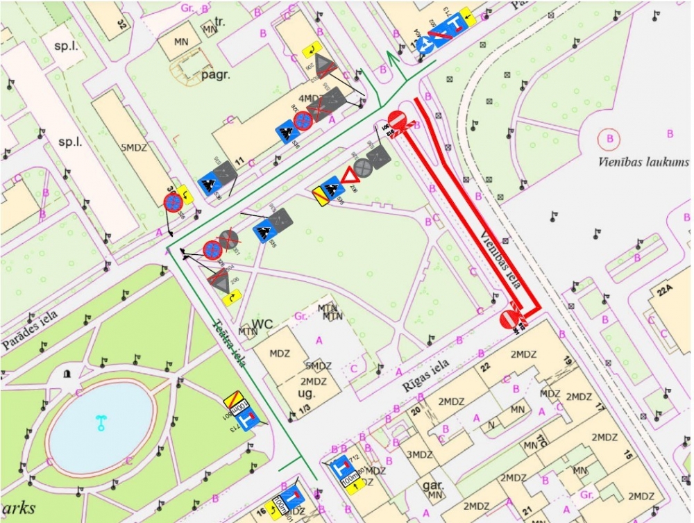 Minēto Vienības ielas posmu varēs apbraukt pa Parādes ielu, kura posmā no Vienības ielas līdz Teātra ielai līdz 8. janvārim tiks atvērta divvirzienu kustībai, bet apstāties šajā ielas posmā būs aizliegts. Ceļa zīmes saskaņā ar pievienoto shēmu tiks uzstādītas no 24. novembra plkst.10.00 līdz 08. janvāra plkst. 07.00.