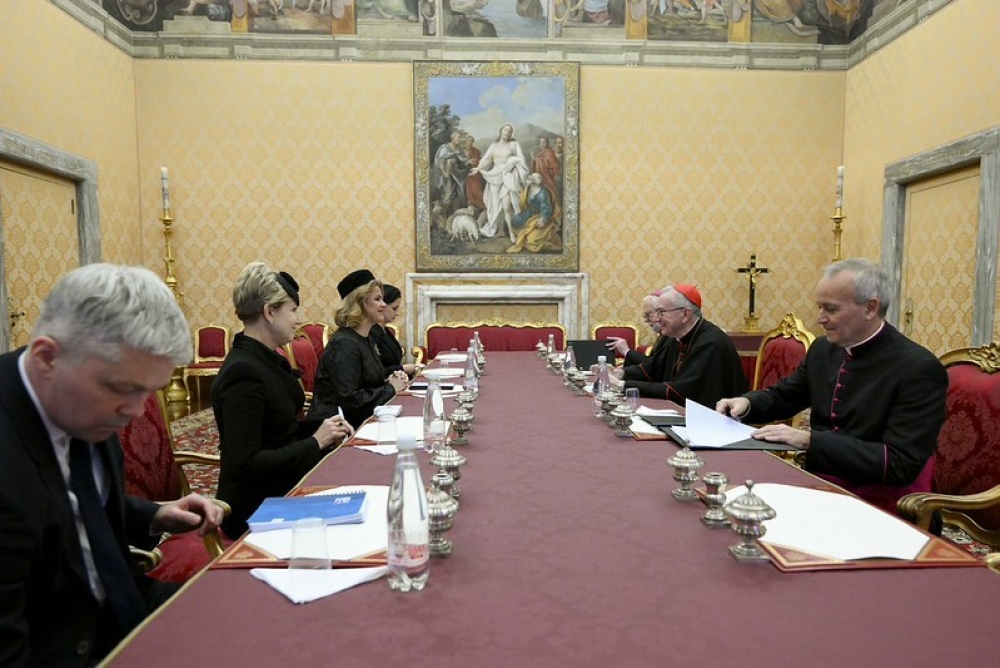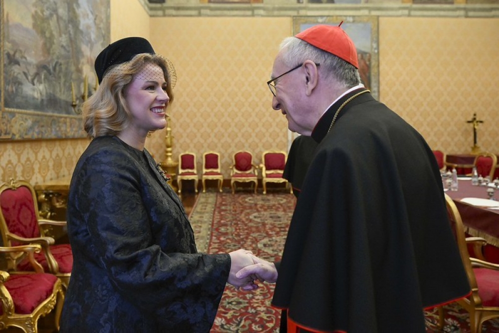 Ministru prezidente tikās arī ar Svētā Krēsla Valsts sekretāru kardinālu Pjetro Parolinu. Sarunās tika apliecināta abu pušu gatavība turpināt aktīvu dialogu par mieru, drošību, ekumenisma tradīcijām Latvijā, starptautisko tiesību nozīmi un sadarbību starptautiskajās organizācijās.