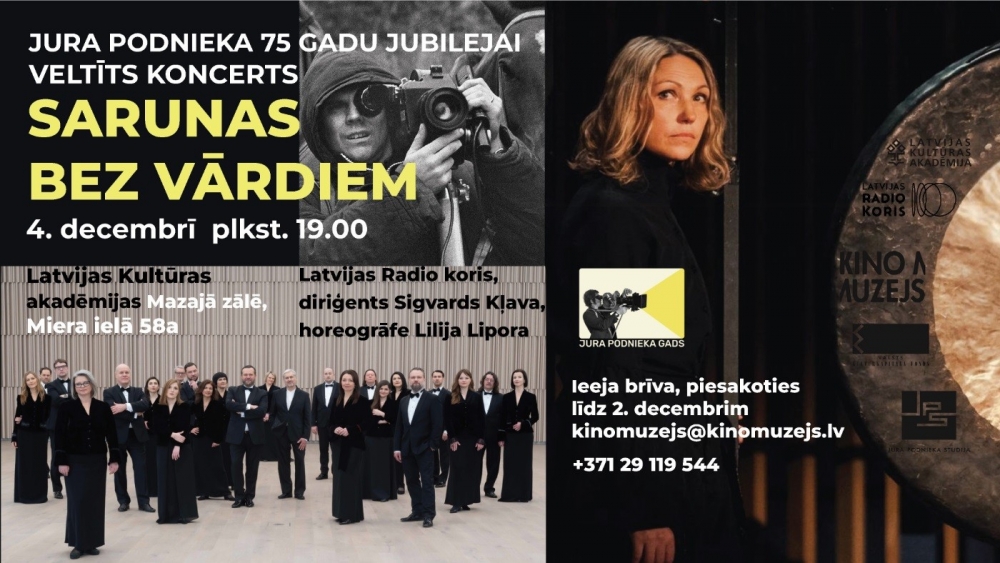 Tajā pašā vakarā, 4. decembrī 19:00, LKA Latvijas Kino muzejs aicina uz režisoram veltītu koncertu Sarunas bez vārdiem, programmā skanēs Džona Keidža, Riharda Zaļupes, Jāņa Ivanova un Žibokles Martinaitītes mūzika. Latvijas Radio koris, diriģents Sigvards Kļava un dejotāja un horeogrāfe Lilija Lipora aicinās ceļojumā, glezniecisku skaņu un kustību pasaulē, kuru rada un veido unikāli instrumenti — cilvēka balss un cilvēka ķermenis. Līdzīgi kā glezniecībā, kur vērojami visdažādākās intensitātes otas triepieni un krāsu faktūras, arī šīs programmas skaņražu mūzikas valodā sastopami visplašākā diapazona izteiksmes veidi, kurus Latvijas Radio kora balsis, Lilijas Liporas kustība un gongu spēle padara par dzīviem mākslas darbiem. Blīvi slāņi mijas ar caurspīdīgu skaņukrāsu faktūru, kas rezultējas pārpasaulīgās mūzikas partitūrās. No smalka minimālisma līdz spriegam un biezam skaņurakstam, bez striktas formas un laika līniju nogriežņiem, brīvi plūstot un ļaujoties mākslas piedzīvojumam.