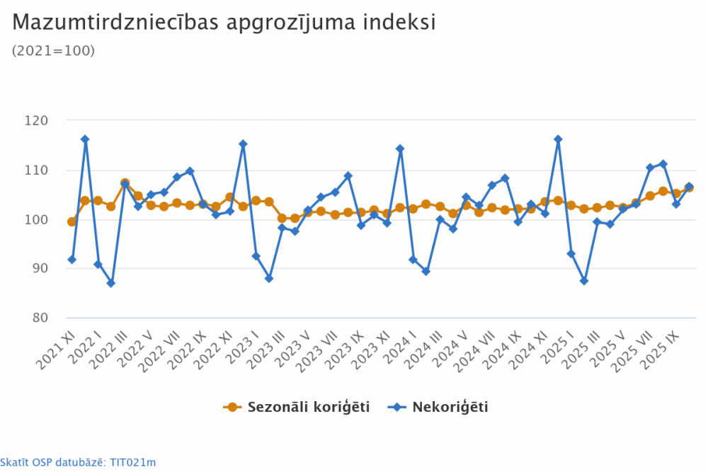2025. gada oktobrī, salīdzinot ar septembri, pēc sezonāli koriģētiem datiem salīdzināmajās cenās mazumtirdzniecības apgrozījums pieauga par 1,2 %. Pārtikas preču mazumtirdzniecība samazinājās par 0,1 %. Nepārtikas preču mazumtirdzniecības apjoms, neieskaitot autodegvielas mazumtirdzniecību, palielinājās par 2,2 %, autodegvielas mazumtirdzniecība palielinājās par 0,8 %.