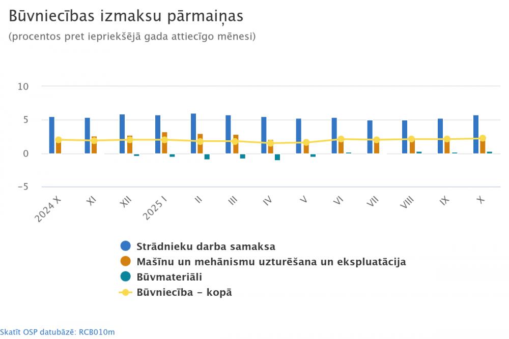 Strādnieku darba samaksa 2025. gada oktobrī, salīdzinot ar 2024. gada oktobri, pieauga par 5,8 %, mašīnu un mehānismu uzturēšanas un ekspluatācijas izmaksas – par 2,0 %, bet būvmateriālu cenas palielinājās par 0,3 %.