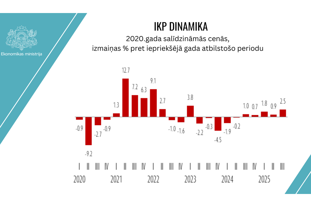 Lielāko pienesumu Latvijas IKP pieaugumam 2025.gada 3.ceturksnī devušas apstrādes rūpniecība, būvniecība un tirdzniecība. Apstrādes rūpniecība pieauga par 7,3%. Īpaši strauja dinamika bija pārtikas produktu ražošanā un koksnes un to izstrādājumu ražošanā. Tikai 6 no 22 apstrādes rūpniecības nozarēm ir bijusi negatīvā dinamika. Straujš kāpums bija arī būvniecības nozarei - par 9%, ko lielā mērā noteica apjomīgas investīcijas infrastruktūras projektos (ceļi, tilti, elektroapgāde). Tirdzniecības nozares pievienotā vērtība pieauga par 3,1%, tai skaitā mazumtirdzniecība – par 1,3%.