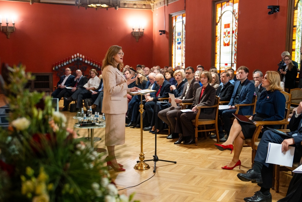 “Latvijas sabiedrība, uzņēmēji, zinātnieki, kultūras un izglītības jomas pārstāvji, politikas veidotāji – mēs katrs skatāmies nākotnē ar savām cerībām un gaidām, un arī – katrs ar savu sapratni par izaicinājumiem. Un demokrātiskas valsts uzdevums ir ne tikai uzklausīt sabiedrības gaidas, bet nostiprināt tās ilgtermiņa politikas ietvarā. Un tieši tādēļ šodien mēs runājam par nākotni, nevis kā lineāru laika nogriezni, bet kā savstarpēji saistītu jomu kopumu,” norādīja Saeimas priekšsēdētājas biedre.