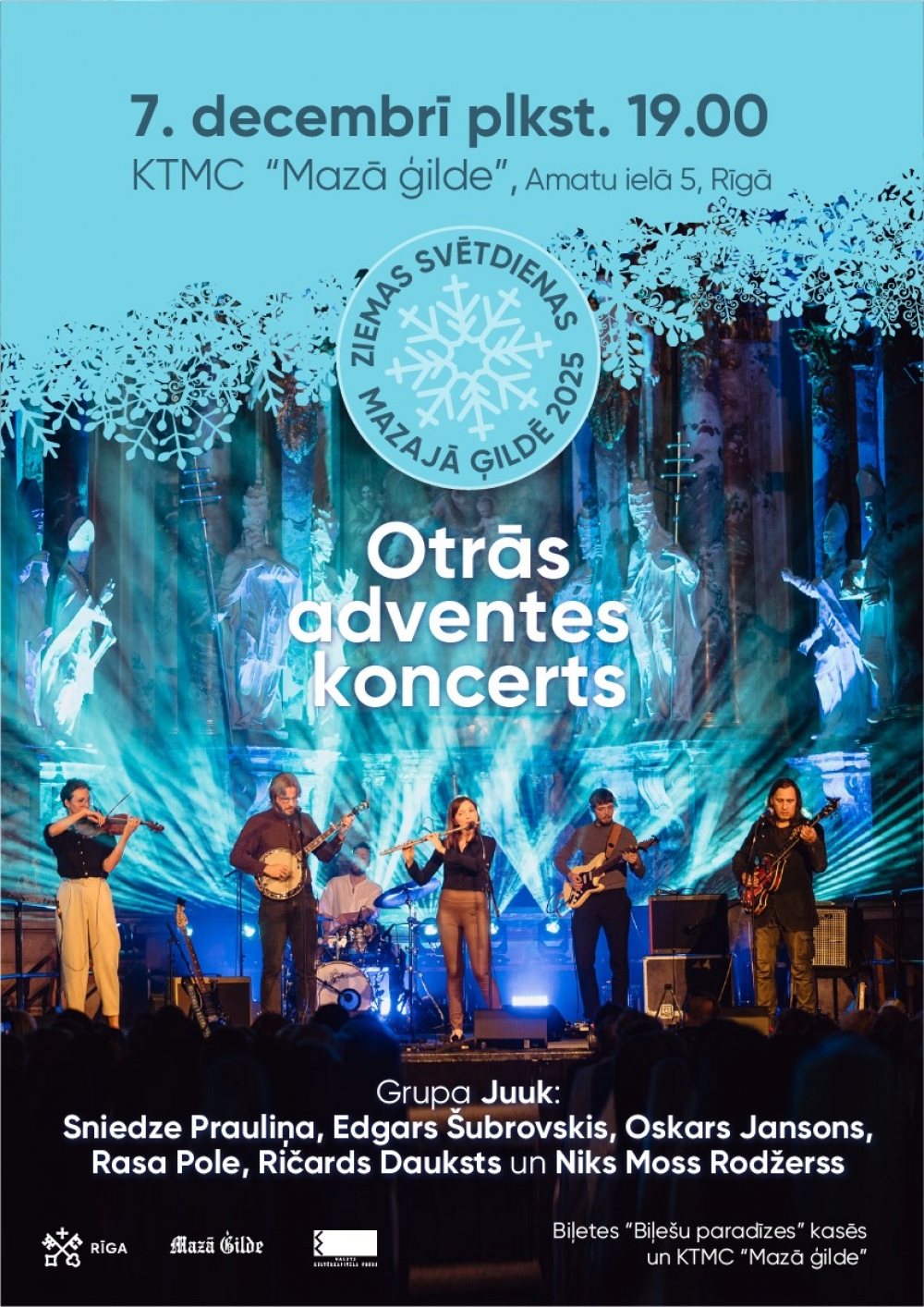 Otrajā adventē, 7. decembrī, koncertu sēriju turpinās grupas “Juuk” ziemas koncerts. Tieši saulgriežu laikā mūziķi klausītājiem dāvās jaunu albumu “Tulkojumi”, kurā apvienotas dažādu tautu un autoru dziesmas un dzeja grupas interpretācijās. Otrās adventes koncertā skanēs ieskats jaunajā albumā, kā arī īpaši pārsteigumi – Sniedzes Prauliņas dziesmas, kas radītas Baltvilka balvas pasniegšanai un līdz šim atskaņotas tikai tur, jauni “Juuk” atradumi senajā un pasaules mūzikā, kā arī viesmākslinieku ziemīgie priekšnesumi. Grupas “Juuk” sastāvā muzicē: Sniedze Prauliņa, Edgars Šubrovskis, Oskars Jansons, Rasa Pole, Ričards Dauksts un Niks Moss Rodžerss.