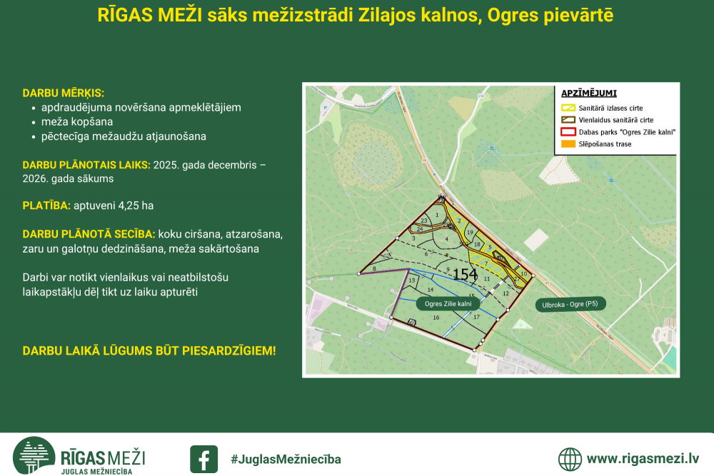 Par plānotajiem darbiem dabas parkā “Ogres Zilie kalni” “Rīgas meži” sabiedrību informēja novembra sākumā, aicinot iedzīvotājus uz sarunām par plānotajām mežizstrādēm un sanitārajām cirtēm Ogres novadā.