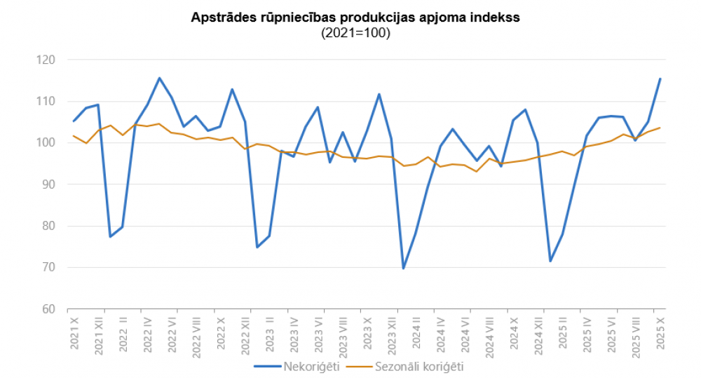 2025. gada oktobrī, salīdzinot ar 2025. gada septembri, rūpniecības produkcijas apjoms pēc sezonāli koriģētiem datiem salīdzināmajās cenās palielinājās par 1,4%. Ražošanas apjoma pieaugums bija apstrādes rūpniecībā – par 0,8%, elektroenerģijas un gāzes apgādē – par 6,5%, kā arī ieguves rūpniecībā un karjeru izstrādē – par 21,9%.