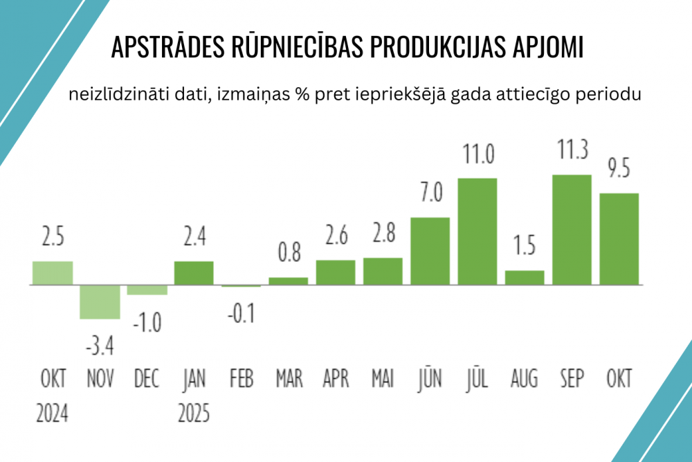 2025. gada oktobrī salīdzinot ar 2024. gada oktobri, gan pēc neizlīdzinātiem, gan arī kalendāri izlīdzinātiem datiem, apstrādes rūpniecības produkcijas apjomi pieauga par 9,5%. Kopumā 2025. gada desmit mēnešos, pēc neizlīdzinātiem datiem, apstrādes rūpniecības produkcijas izlaide bija par 5,1% augstāka nekā pirms gada.