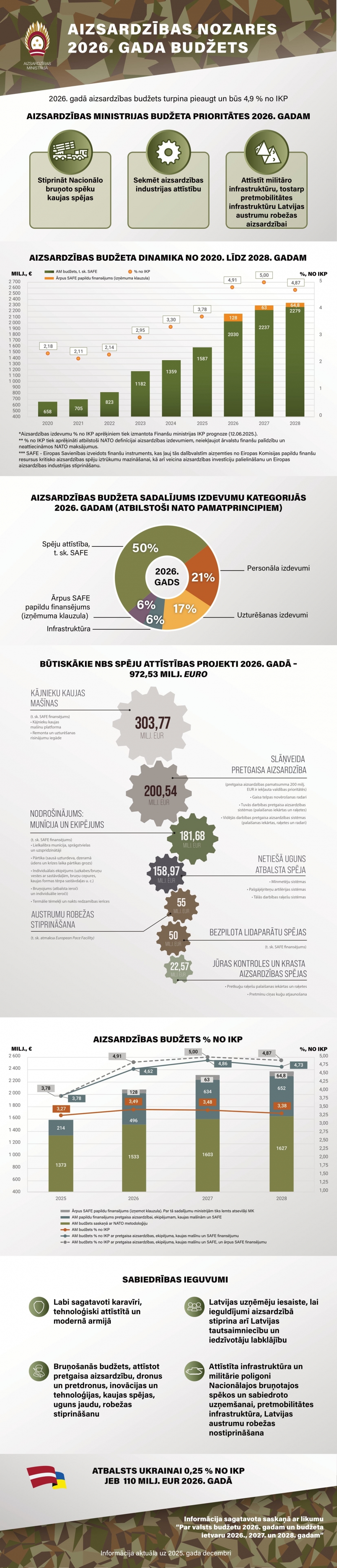 Militārās infrastruktūras attīstībai paredzēti 135 miljoni eiro, tostarp Sēlijas poligona būvniecības turpināšanai un pretmobilitātes infrastruktūras izveidei Latvijas austrumu robežas stiprināšanai, kam novirzīti 55 miljoni eiro. Vienlaikus aizsardzības nozare turpinās sniegt nozīmīgu atbalstu Ukrainai – tam paredzēti 0,25 % no IKP jeb 110 miljoni eiro.