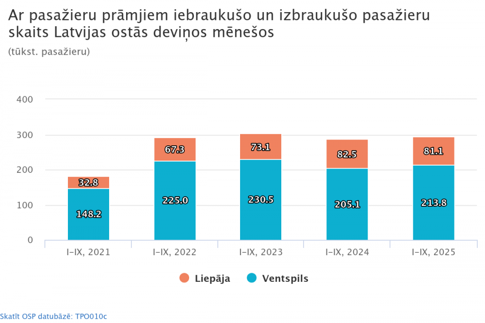 2025. gada pirmajos deviņos mēnešos ar prāmjiem Ventspils un Liepājas ostās iebrauca un no tām izbrauca 294,9 tūkst. pasažieru. To skaits pieauga par 2,5 %, salīdzinot ar 2024. gada pirmajiem deviņiem mēnešiem. Ventspils ostā pasažieru apgrozījums bija 213,8 tūkst. pasažieru, kas ir par 4,2 % vairāk, bet Liepājas ostā – 81,1 tūkst. pasažieru, kas ir par 1,7 % mazāk.