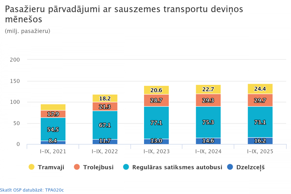 2025. gada pirmajos deviņos mēnešos ar sauszemes pasažieru transportu pārvadāja 143,4 milj. pasažieru, kas ir par 1,1 % vairāk nekā 2024. gada pirmajos deviņos mēnešos.