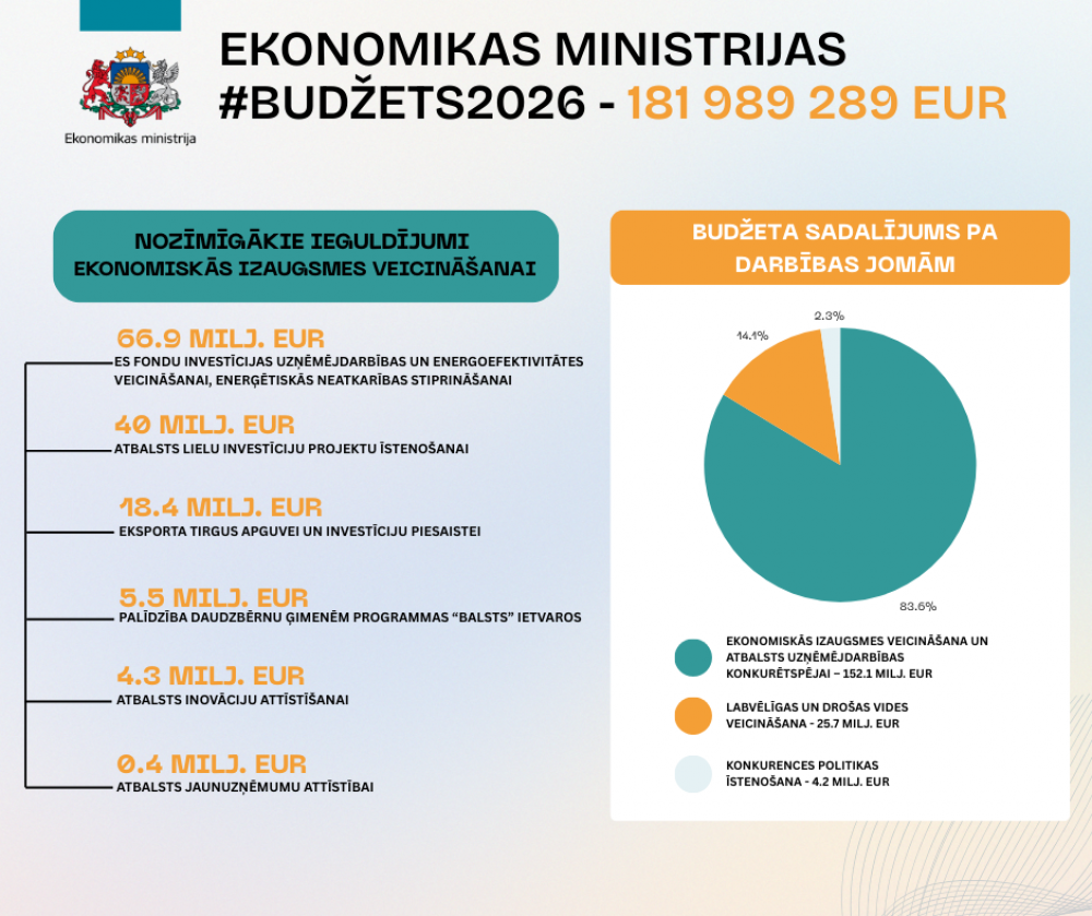 “Nākama gada budžets fokusēsies uz atbalsta pasākumiem uzņēmējdarbībai un ekonomiskās izaugsmes veicināšanai. Mūsu uzdevums ir Latvijā radīt vidi, kurā veidojas arvien vairāk inovatīvu, augstas pievienotās vērtības uzņēmumu, kas spēj nodrošināt, gan vietējo tirgu, gan sekmīgi tos eksportēt. Šādu uzņēmumu attīstība ir pamats ilgtspējīgai un konkurētspējīgai ekonomikas izaugsmes. Vienlaikus tiks turpināts atbalsts arī daudzbērnu ģimenēm programmas “BALSTS” ietvaros,” uzsver ekonomikas ministrs Viktors Valainis.