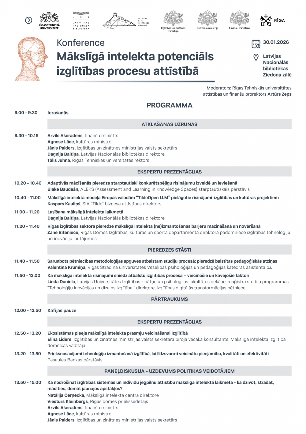 Savukārt konferenci noslēgs diskusija, kurā tiks meklētas atbildes uz jautājumu, kā nodrošināt izglītības sistēmas un indivīdu jēgpilnu attīstību mākslīgā intelekta laikmetā. Diskusijā piedalīsies Mākslīgā intelekta centra direktore Natālija Čerņecka, Rīgas domes priekšsēdētājs Viesturs Kleinbergs, finanšu ministrs Arvils Ašeradens, kultūras ministre Agnese Lāce un IZM valsts sekretārs Jānis Paiders. Diskusiju un konferenci vadīs Rīgas Tehniskās universitātes (RTU) attīstības un finanšu prorektors Artūrs Zeps.