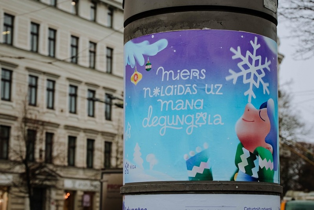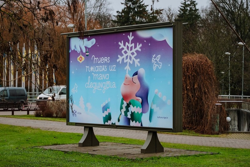 “Miers nolaidās uz mana degungala” – tāds ir šī gada Ziemassvētku gaidīšanas laika un svētku vizuālās identitātes Rīgas pilsētvidē vadmotīvs. Ilustrācijas centrā ir jauna puiša tēls ar sniegpārsliņu uz degungala. Izbaudot šo mirkli – ilgi gaidītās ziemas sajūtas atnākšanu, – apstājas laiks. Tas vizuāli akcentē gada noslēgumu arī kā pārdomu laiku, – brīdi, kad tiek pieņemti dzīvi mainoši lēmumi, kad dzimst idejas un apņemšanās nākamajam gadam. Bet pāri visam miers – tik būtisks Ziemassvētku laikā gan mums, gan visai pasaulei.