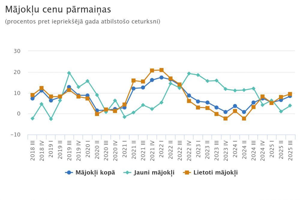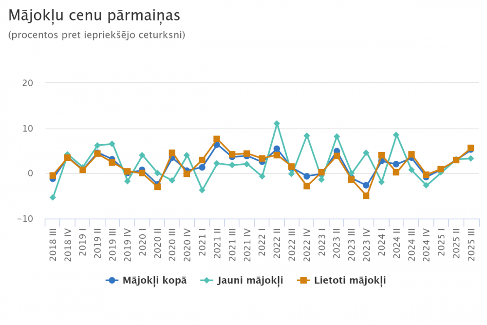 2025. gada 3. ceturksnī, salīdzinot ar 2025. gada 2. ceturksni, mājokļu cenas palielinājās par 5,2 %. Jauniem mājokļiem cenas palielinājās par 3,3 %, bet lietoti mājokļi bija par 5,6 % dārgāki.