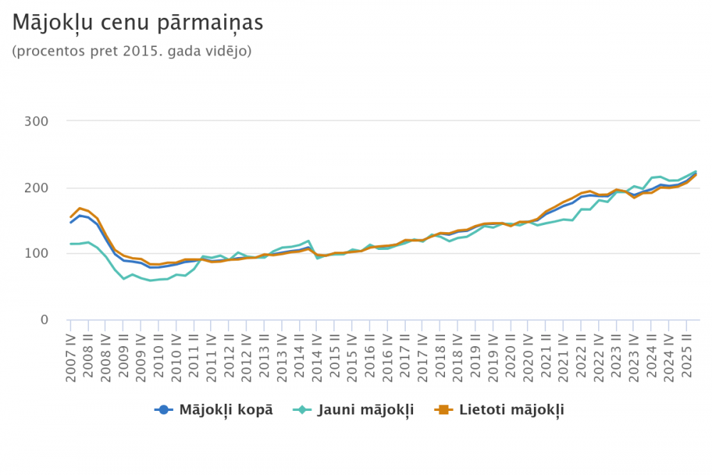 Salīdzinot ar 2015. gadu, mājokļu cenas 2025. gada 3. ceturksnī bija par 120,7 % augstākas. Jauniem mājokļiem cenas pieauga par 123,9 %, bet lietotiem mājokļiem – par 118,5 %.