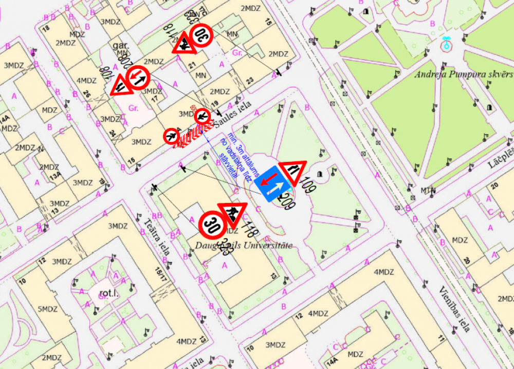 Minētajā Saules ielas posmā darba dienās no plkst. 8.00 līdz 16.00 uz ietves un daļēji arī uz brauktuves atradīsies autotornis, kas kļūs par šķērsli kustībai virzienā no Andreja Pumpura skvēra. Apbraucot specializēto tehniku, priekšroka ir transportam, kas virzās pretējā virzienā (uz A. Pumpura skvēru). Būvdarbu veikšanas laikā šajā posmā noteikts maksimālā braukšanas ātruma ierobežojums - 30 km/h. Arī gājēju kustība tiks arī ierobežota.