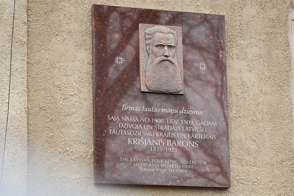 Tagad uz plāksnes ir uzraksti latviešu un angļu valodā, jo Rīgas Pieminekļu aģentūra uzskata, ka ir būtiski informēt tūristus par nozīmīgāko Krišjāņa Barona darbu – latviešu tautasdziesmu apkopošanu, sistematizēšanu un publicēšanu krājumā “Latvju dainas”. Viņš bija pirmais latvietis, ko vācu draudze atļāva izvadīt no Doma baznīcas.