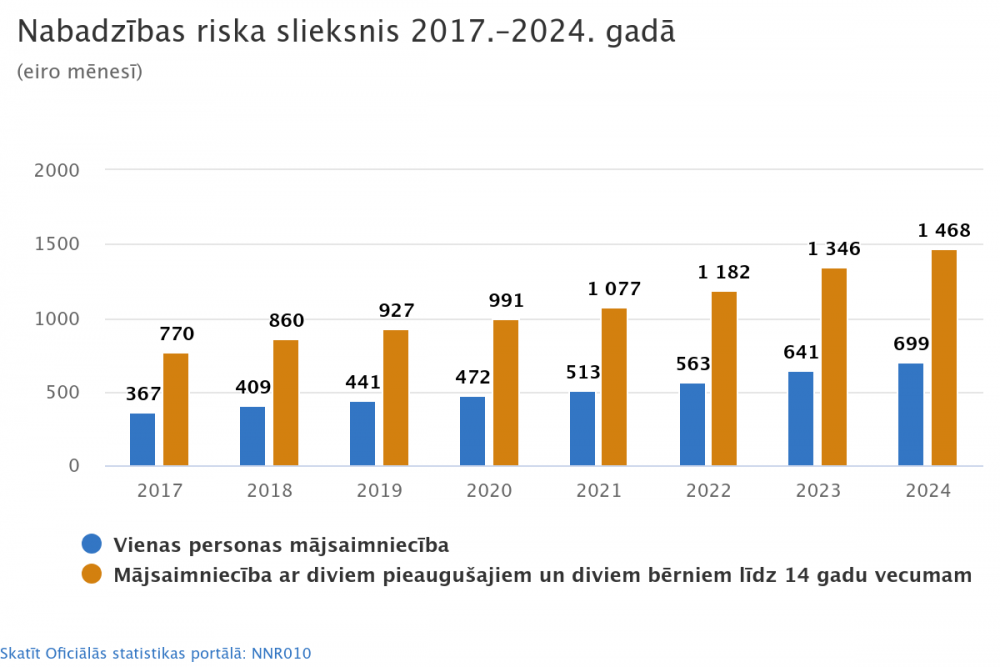 Pagājušajā gadā, palielinoties mājsaimniecību rīcībā esošajiem ienākumiem, pieauga arī nabadzības riska slieksnis, sasniedzot 699 eiro mēnesī vienas personas mājsaimniecībai (2023. gadā – 641 eiro mēnesī). Mājsaimniecībām ar diviem pieaugušajiem un diviem bērniem līdz 14 gadu vecumam nabadzības riska slieksnis 2024. gadā sasniedza 1 468 eiro mēnesī (2023. gadā – 1 346 eiro mēnesī).