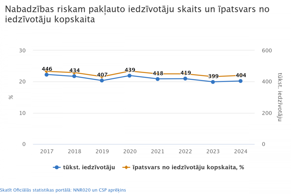 Pērn nabadzības riskam bija pakļauti 404 tūkstoši jeb 22,0 % iedzīvotāju, viņu ienākumi bija zemāki par 699 eiro uz vienu personu mēnesī (2023. gadā – 21,6 % iedzīvotāju).