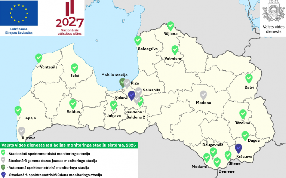 Radiācijas līmeņa nepārtrauktu novērošanu Latvijā tiešsaistes režīmā līdz 2025. gadam nodrošināja 24 stacionāras radiācijas monitoringa stacijas: Baldonē (2 stacijas), Balvos, Daugavpilī (2 stacijas), Demenē, Jelgavā, Liepājā, Madonā, Medumos, Rēzeknē, Rīgā, Rucavā, Rūjienā, Salacgrīvā, Salaspilī, Silenē, Talsos, Valmierā un Ventspilī, kā arī 1 pārvietojamā stacija, 1 aerosolu stacija - Daugavpilī, un divas ūdens stacijas - Ķekavā un Krāslavā. Šobrīd radiācijas monitoringa staciju sistēmai pievienoti jauni monitoringa punkti arī Saldū un Dagdā.