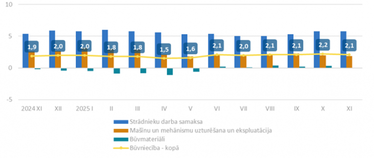 Strādnieku darba samaksa 2025. gada novembrī, salīdzinot ar 2024. gada novembri, pieauga par 5,8%, mašīnu un mehānismu uzturēšanas un ekspluatācijas izmaksas – par 1,9%, bet būvmateriālu cenu līmenis nemainījās.