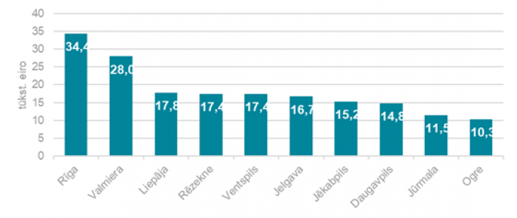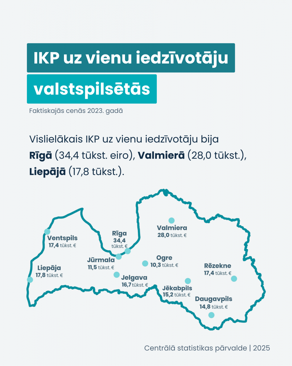 2023. gadā starp valstspilsētām vislielākais IKP uz vienu iedzīvotāju – 34,4 tūkst. eiro – bija galvaspilsētā. Otrajā vietā bija Valmiera ar 28,0 tūkst., trešajā – Liepāja ar 17,8 tūkst. eiro. Tam sekoja Rēzekne un Ventspils ar 17,4 tūkst., Jelgava ar 16,7 tūkst., Jēkabpils ar 15,2 tūkst., Daugavpils ar 14,8 tūkst., Jūrmala ar 11,5 tūkst. un Ogre ar 10,3 tūkst. eiro uz vienu iedzīvotāju.