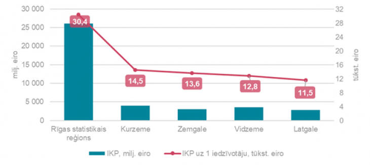 Ņemot vērā atšķirības reģionu iedzīvotāju skaitā, ir lietderīgi salīdzināt statistiskos reģionus pēc IKP uz vienu iedzīvotāju. Vislielākais IKP uz vienu iedzīvotāju ir Rīgas reģionā (30,4 tūkst. eiro), bet vismazākais – Latgales reģionā (11,5 tūkst. eiro). Tādejādi produktivitāte Rīgas reģionā ir 2,6 reizes lielāka nekā Latgales reģionā. Kurzemē IKP uz vienu iedzīvotāju ir 14,5 tūkst. eiro, Vidzemē – 12,8 tūkst. eiro, Zemgalē – 13,6 tūkst. eiro.