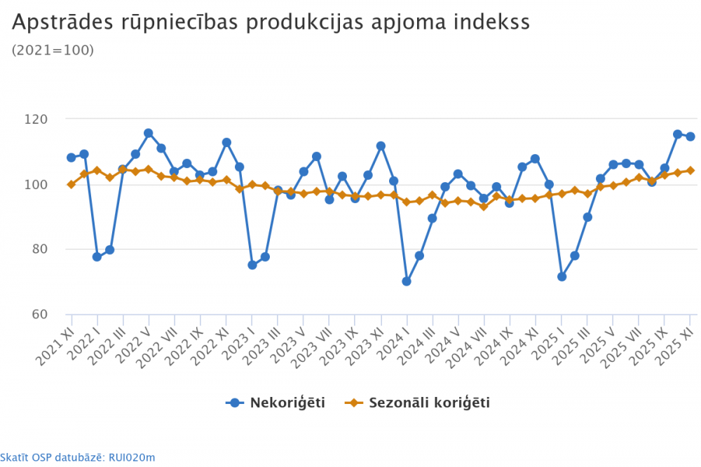 2025. gada novembrī, salīdzinot ar 2025. gada oktobri, rūpniecības produkcijas apjoms pēc sezonāli koriģētiem datiem salīdzināmajās cenās samazinājās par 0,6 %. Apstrādes rūpniecībā ražošanas apjoms pieauga par 0,5 %, savukārt kritums bija elektroenerģijas un gāzes apgādē – par 6,1 % un ieguves rūpniecībā un karjeru izstrādē – par 6,4 %.