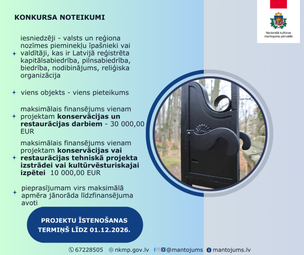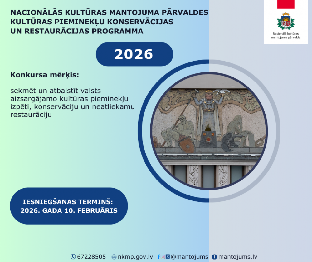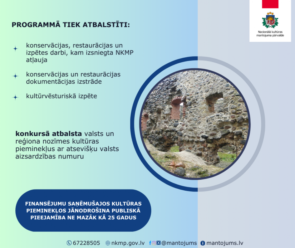 Plašāka informācija par programmu un 2026. gada konkursa nolikums atrodams sadaļā Kultūras pieminekļu konservācijas un restaurācijas programma.