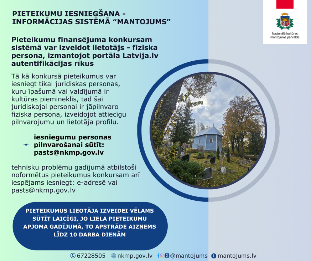 Šogad pirmo reizi pieteikumu iesniegšana konkursam tiek organizēta informācijas sistēmā “Mantojums”. Sistēmai var piekļūt izmantojot portāla Latvija.lv autentifikācijas rīkus. Tā kā konkursā pieteikumus var iesniegt tikai juridiskas personas, kuru īpašumā vai valdījumā ir kultūras piemineklis, tad šai juridiskajai personai ir jāpilnvaro fiziska persona, izveidojot attiecīgu pilnvarojumu un lietotāja profilu. Pilnvarotā fiziskā persona juridiskās personas vārdā varēs aizpildīt un iesniegt pieteikumu sistēmā.
