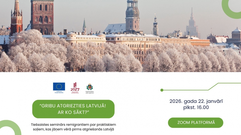 2026. gadā NVA un EURES semināri “Gribu atgriezties Latvijā! Ar ko sākt?” tiešsaistes platformā Zoom norisināsies 22. janvārī, 16. aprīlī, 23. jūlijā un 22. oktobrī. Katra tiešsaistes semināra ilgums – 1 stunda, sākums - plkst.16.00 pēc Latvijas laika.