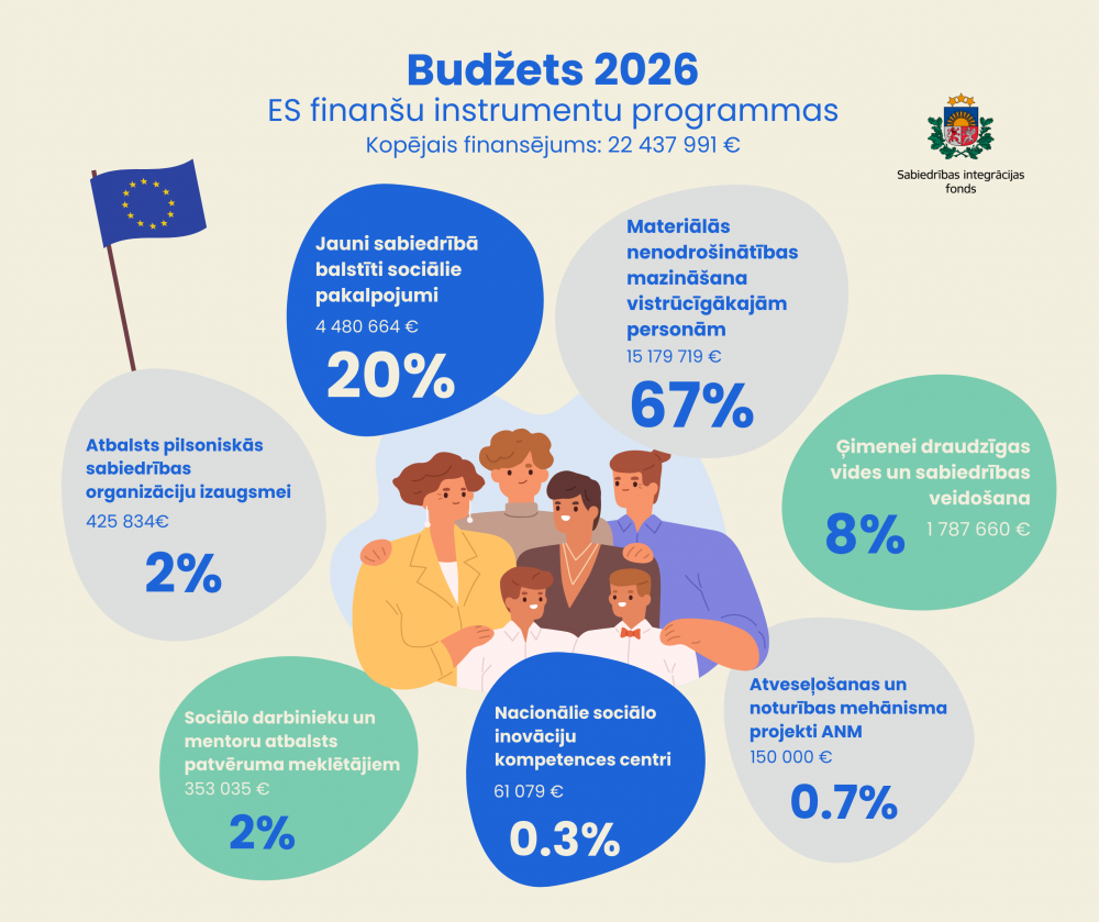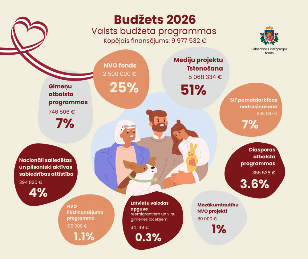 Ar valsts budžeta finansējumu 2026. gadā paredzēts atbalsts vairākām būtiskām jomām. Mediju projektu īstenošanai plānoti 5 miljoni eiro, veicinot kvalitatīvu, sabiedriski nozīmīgu saturu un stipru informatīvo telpu. NVO atbalsta un sabiedrības saliedētības programmai paredzēts finansējums 2,5 miljonu eiro apmērā, stiprinot pilsonisko līdzdalību un sabiedrības noturību. Tāpat 2026. gadā ģimeņu atbalsta programmām paredzēts finansējums 746 tūkstošu eiro apmērā. Diasporas atbalstam plānoti 355 tūkstoši eiro, savukārt mazākumtautību nevalstisko organizāciju atbalstam – 80 tūkstoši eiro.