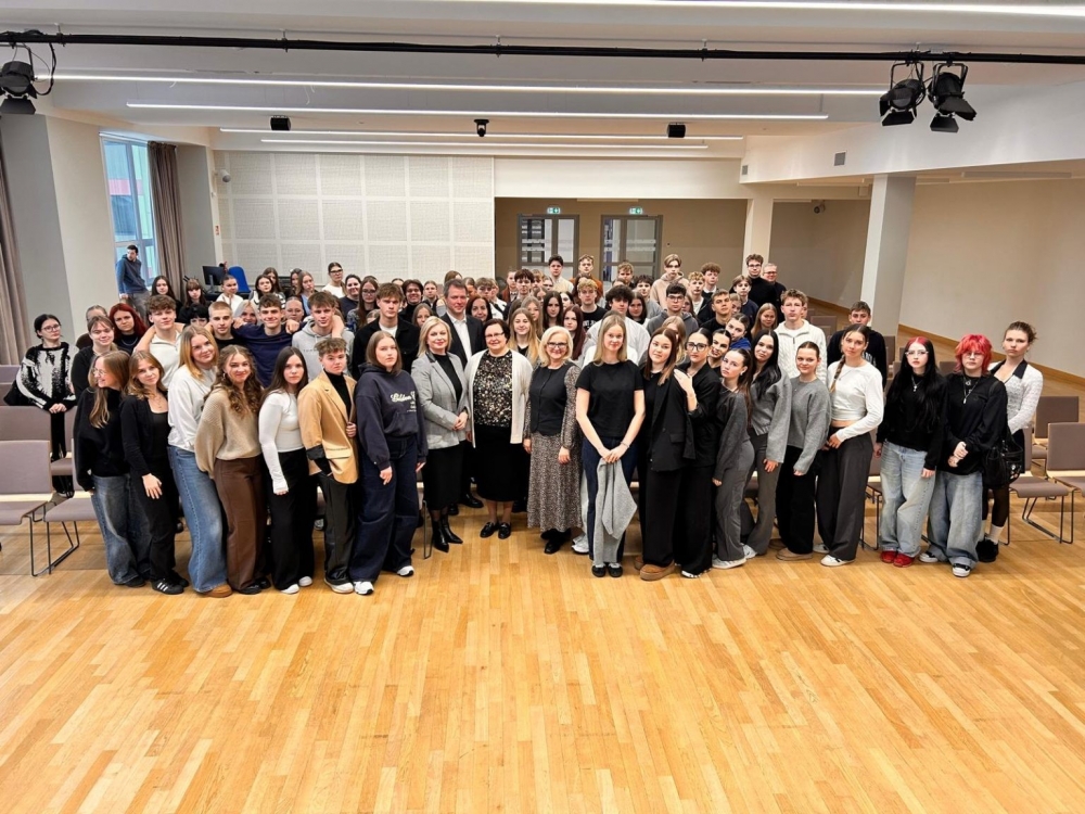 Attēlā: tikšanās ar Jelgavas Tehnoloģiju vidusskolas audzēkņiem.