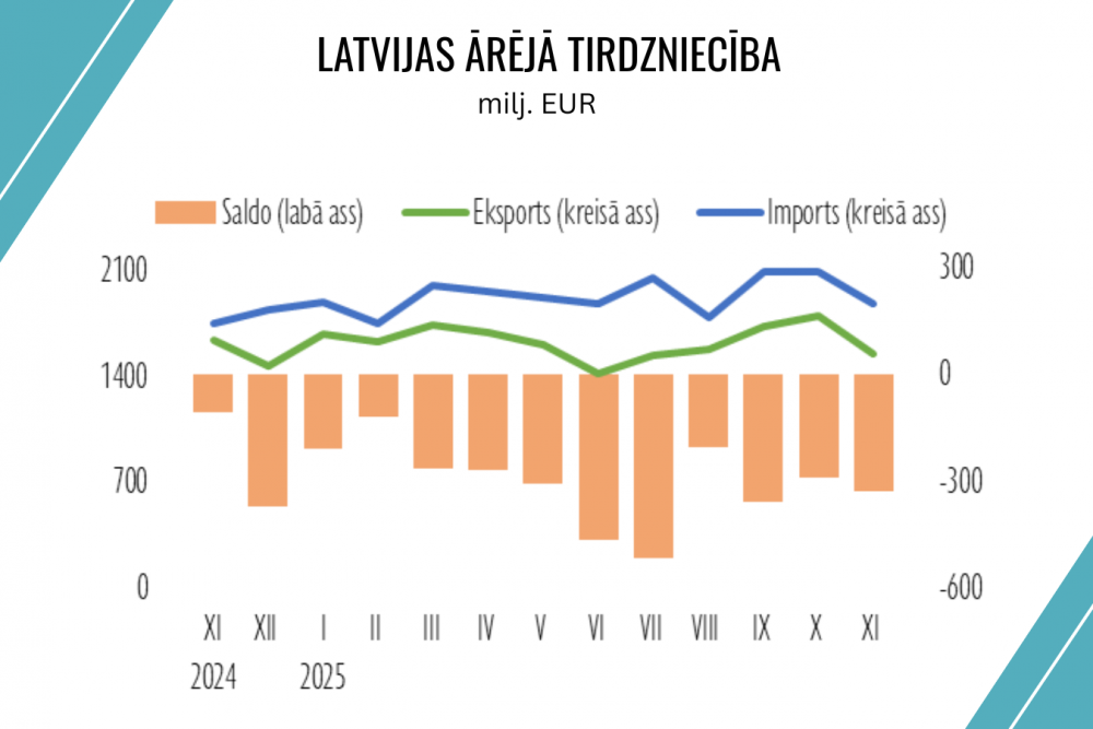 Novembrī gada griezumā – par 7,4% – turpināja augt importa vērtība. Šo pieaugumu pozitīvi ietekmēja elektroierīču un iekārtu, mehānismu, sauszemes transportlīdzekļu un minerālo produktu importa izaugsme. Būtiski pieauga imports no ES un citām valstīm, izņemot NVS valstis. Imports no NVS valstīm novembrī turpināja strauji sarukt – par 55% –, salīdzinot ar 2024. gada novembri. Kopumā 2025. gada vienpadsmit mēnešos preču importa apjomi bija par 7,4% lielāki nekā pirms gada. Šo pieaugumu būtiskāk ietekmēja mehānismu un ierīču, minerālo produktu un ķīmiskās rūpniecības preču importa pieaugums.