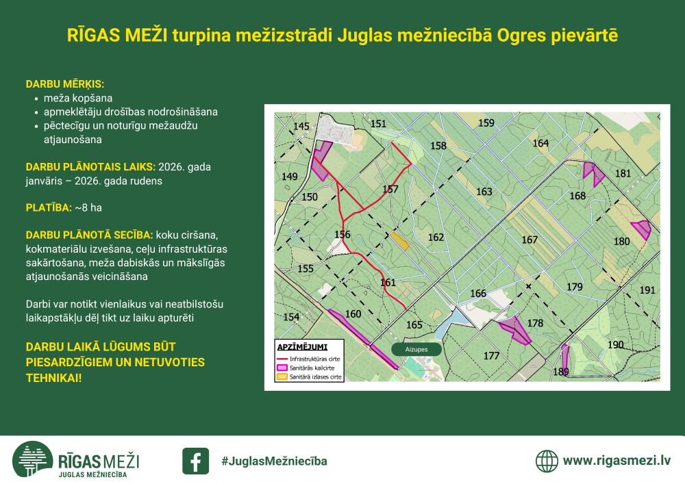 “Rīgas meži” aicina iedzīvotājus ar izpratni izturēties pret mežsaimniecības darbiem un ievērot drošības prasības un norādes darbu norises vietās.
