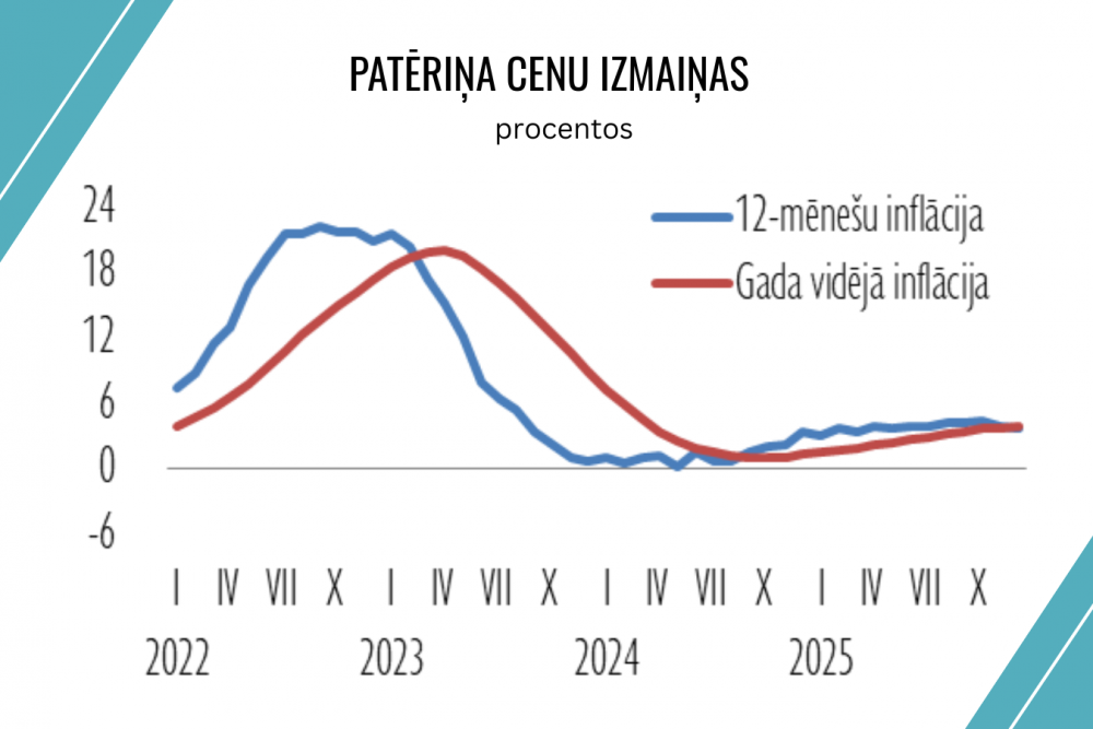2025. gadā kopumā patēriņa cenas pieauga nedaudz straujāk kā iepriekšējā gadā. Patēriņa cenas 2025. gada decembrī, salīdzinot ar iepriekšējā gada decembri, pieauga par 3,5%. Cenu dinamiku noteica gan energoresursu un pārtikas cenu svārstības pasaulē, gan joprojām nestabilā ģeopolitiskā vide, bet nozīmīga bija arī vietējo tarifu pārmaiņu ietekme – īpaši ar mājokli saistīto energoresursu un pakalpojumu tarifu paaugstinājums gada laikā.