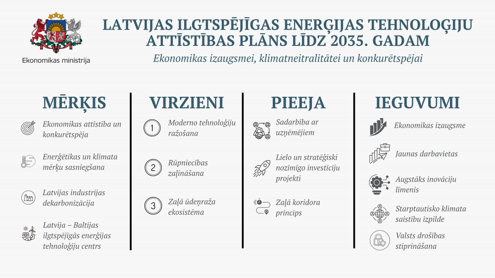 Tāpat plānā iekļauta produktivitātes un klimata mērķu sasniegšana, vienlaikus izmantojot ilgtspējīgas enerģijas tehnoloģijas esošās Latvijas industrijas dekarbonizācijai.