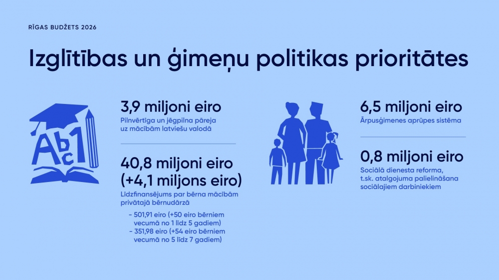 Salīdzinot ar 2025. gada budžetu, dažādiem izdevumiem sociālajā sfērā šogad piešķirti papildu 16,2 miljoni eiro, līdz ar to kopumā Rīgas pilsētas budžetā ģimeņu un sociālajai politikai atvēlēti 158,2 miljoni eiro.