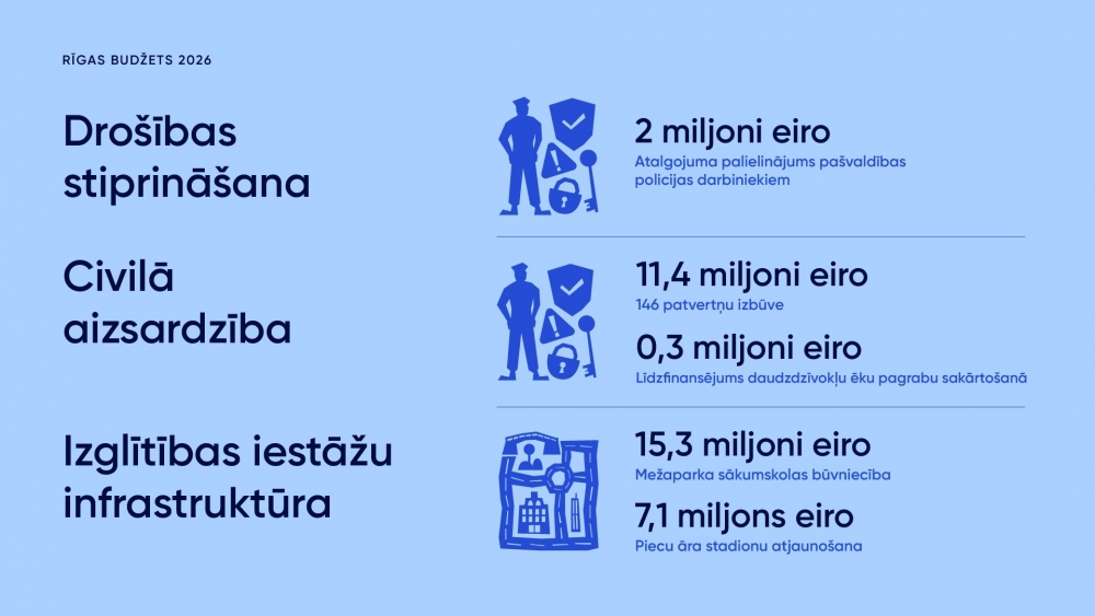 “Viena no manām prioritātēm būs drošības stiprināšana Rīgā. Šogad palielināsim Rīgas pašvaldības policistu atalgojumu par diviem miljoniem eiro, par 16% palielinot kārtībniekiem, par 8% - 10% inspektoriem. 2026. gada sākumā tiks pabeigts investīciju projekts policijas vienotā vadības un videonovērošanas centra izveidei Lēdurgas ielā 26, lai nodrošinātu augstākas reaģēšanas spējas krīzēs. Savukārt civilās aizsardzības jomā paredzēts kopā ar valsts finansējumu attīstīsim un labiekārtosim 146 pašvaldības patvertnes, kā arī uzsāksim līdzfinansējuma programmu daudzdzīvokļu ēku pagrabu sakārtošanā,” norāda Rīgas vicemērs Edvards Ratnieks.