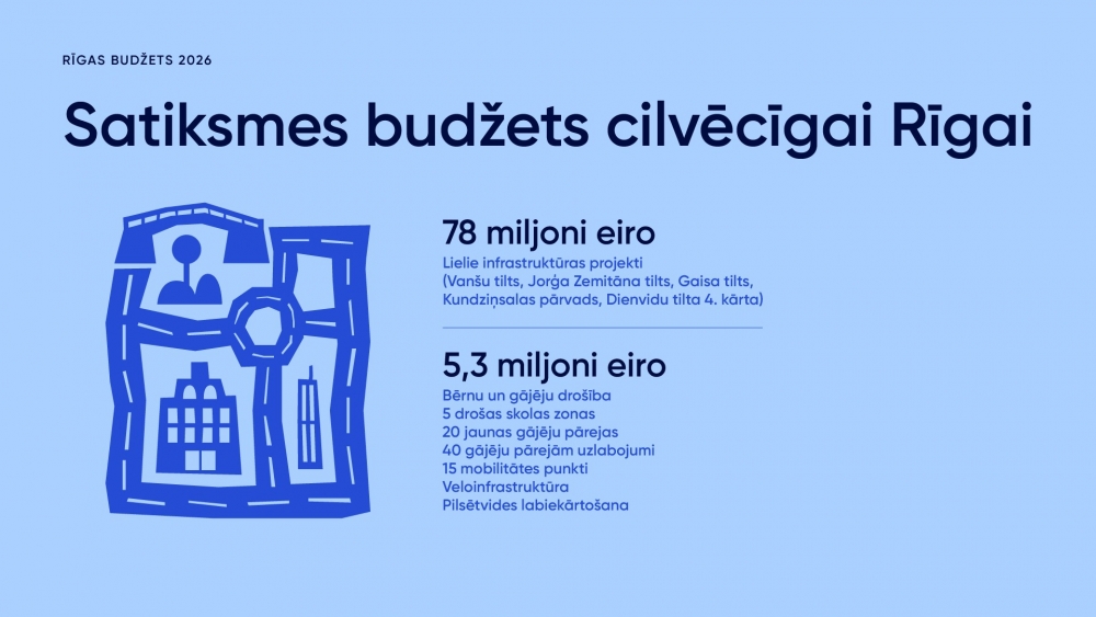 Rīgas pašvaldība 2026. gadā plāno vairāk nekā 200 miljonu eiro investīcijas izglītībā, transporta nozarē un pilsētvides attīstībā. No šī apjoma 78 miljoni eiro paredzēti nozīmīgu infrastruktūras projektu īstenošanai, tostarp Vanšu, Jorģa Zemitāna un Gaisa tilta atjaunošanai, kā arī Kundziņsalas pārvada un Dienvidu tilta 4. kārtas būvniecībai. Savukārt 5,3 miljoni eiro tiks novirzīti pilsētvides labiekārtošanai un gājēju drošības uzlabošanai — paredzēts ierīkot 20 jaunas gājēju pārejas, uzlabot 40 esošās, izveidot piecas drošas skolas zonas un attīstīt jaunu veloinfrastruktūru.