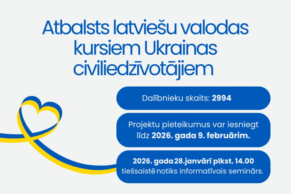 Projektu iesniedzēju ērtībai 2026. gada 28. janvārī plkst. 14.00 notiks informatīvais seminārs, kur projektu pieteicējiem būs iespēja uzdot sev interesējošus jautājumus pirms projektu pieteikuma iesniegšanas. Pieteikties dalībai seminārā iespējams, rakstot uz e-pasta adresi: liga.karklina@sif.gov.lv un norādot savu vārdu un uzvārdu, kā arī pārstāvēto mācību iestādi.