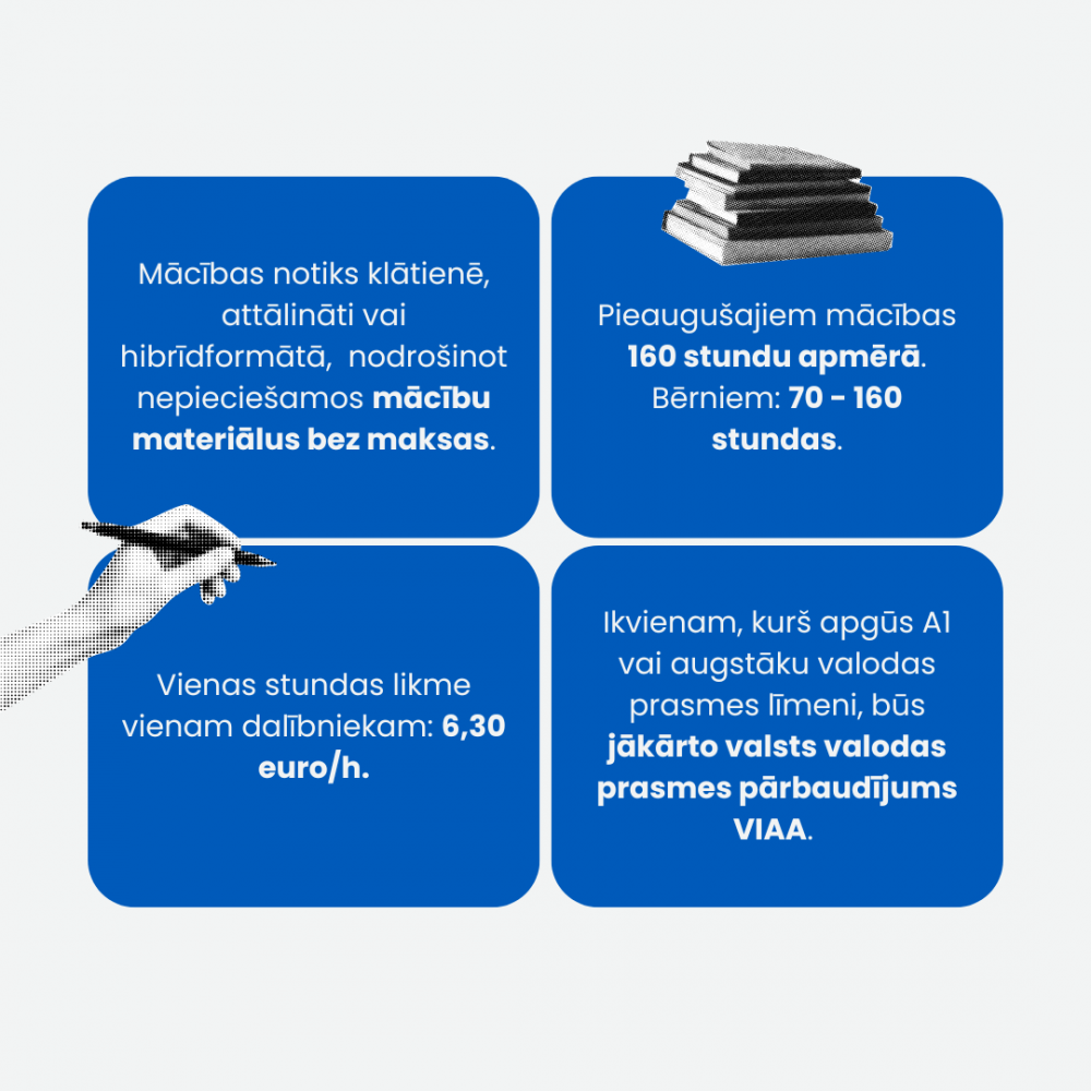 Mācības tiks organizētas saskaņā ar sešiem valodas prasmes līmeņiem – A1, A2, B1, B2, C1 un C2 – un tiks īstenotas, izmantojot Latviešu valodas aģentūras izstrādātos mācību programmu paraugus vai pakalpojuma sniedzēja paša autorprogrammas.
