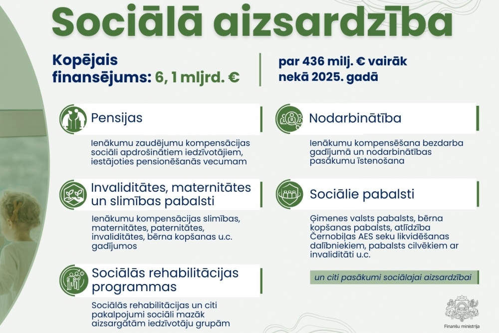 Novirzot vairāk nekā trešdaļu no visiem valsts budžeta izdevumiem sociālajai aizsardzībai, 2026. gada budžets nostiprina sociālās drošības sistēmu kā vienu no valsts attīstības pamatiem, veidojot stabilu, iekļaujošu un noturīgu sabiedrību ilgtermiņā.