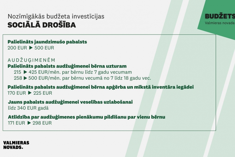 Viena no būtiskākajām izmaiņām ir pabalsta bērna piedzimšanas gadījumā palielinājums – līdzšinējo 200 eiro vietā tie būs 500 eiro par katru bērnu, kura deklarētā dzīvesvieta no dzimšanas reģistrācijas brīža ir Valmieras novada administratīvajā teritorijā. Pabalsts 500 eiro apmērā un izmaksu kārtība attiecināma uz bērniem, kuri dzimuši, sākot no 2026. gada 1. janvāra. Bērna piedzimšanas pabalsts tiks izmaksāts divās daļās – 200 eiro apmērā pēc bērna piedzimšanas un 300 eiro apmērā, bērnam sasniedzot viena gada vecumu. Pabalstu bērna piedzimšanas gadījumā piešķir vienam no bērna vecākiem, ja viens no bērna vecākiem bez pārtraukuma, kā arī ne mazāk kā sešus mēnešus pirms bērna dzimšanas un līdz materiālā pabalsta pēdējai izmaksai ir deklarēts Valmieras novada administratīvajā teritorijā; vienam no aizbildņiem vai adoptētājiem, tai skaitā adoptētājiem, kuriem bērns nodots pirmsadopcijas aprūpē, ja šis pabalsts nav izmaksāts vienam no bērna vecākiem; vienam no bērna audžuvecākiem, ja bērns nodots ārpusģimenes aprūpē un šis pabalsts nav izmaksāts vienam no bērna vecākiem. Valmieras novada pašvaldība šim mērķim 2026. gada budžetā atvēlēs aptuveni 78 000 eiro.