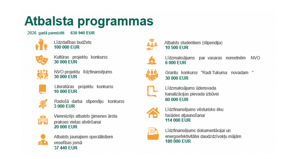 Lai veicinātu sabiedrisko aktivitāti, kultūras un izglītības iniciatīvas, veselības aprūpes pieejamību, kā arī teritorijas un uzņēmējdarbības attīstību, Tukuma novada pašvaldība 2026. gadā īsteno vairākas atbalsta programmas, nodrošinot mērķētu finansējumu dažādām iedzīvotāju un organizāciju iniciatīvām.