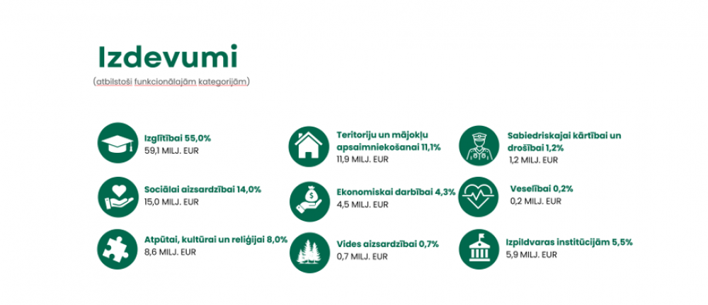 Lielāko izdevumu daļu veido atlīdzība – 51,4% jeb 4 429 297 eiro, kas nodrošina iestāžu darbību un pakalpojumu sniegšanu. Būtisks finansējums paredzēts arī nozīmīgu pasākumu īstenošanai visā novadā – 242 000 eiro lielajiem novada pasākumiem, 195 000 eiro tradīciju pasākumiem un 923 905 eiro citiem kultūras pasākumiem.