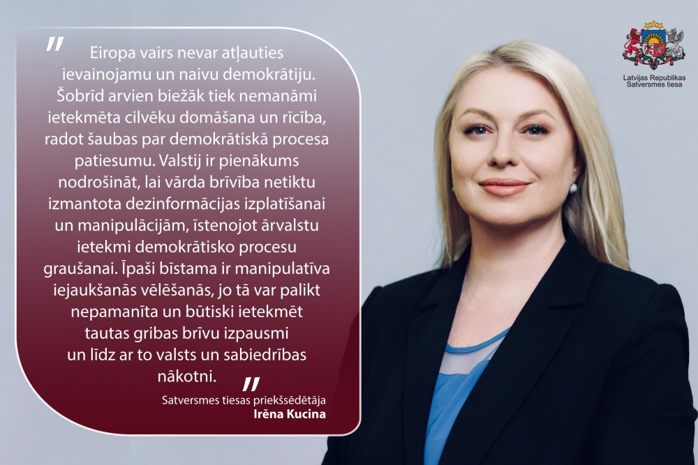 “Vārda brīvība ir demokrātijas pamats, taču valstij ir pienākums nodrošināt, lai tā netiktu izmantota dezinformācijas izplatīšanai un manipulācijām, īstenojot ārvalstu ietekmi demokrātisko procesu graušanai. Šādos gadījumos problēma nav atšķirīgi viedokļi, bet gan apzināta manipulēšana ar apstākļiem, ietekmējot sabiedrības brīvās gribas veidošanos. Valstij nav jāgaida, līdz apdraudējums ir iestājies un radījis negatīvas sekas. Ja ir pamatots risks attiecībā uz negodīgu vēlēšanu iznākumu, valstis drīkst ieviest preventīvus aizsardzības pasākumus, sargājot pilsoņus no slēptas ietekmes. Šāda pieeja nevis ierobežo demokrātiju, bet palīdz to aizsargāt. Brīvā pasaule dzīvo, ja tiesiskumu pavada modrība – kamēr kopā būsim savu vērtību sardzē ik dienu, mūsu demokrātijas saglabās spēju sevi aizstāvēt,” akcentē Irēna Kucina.