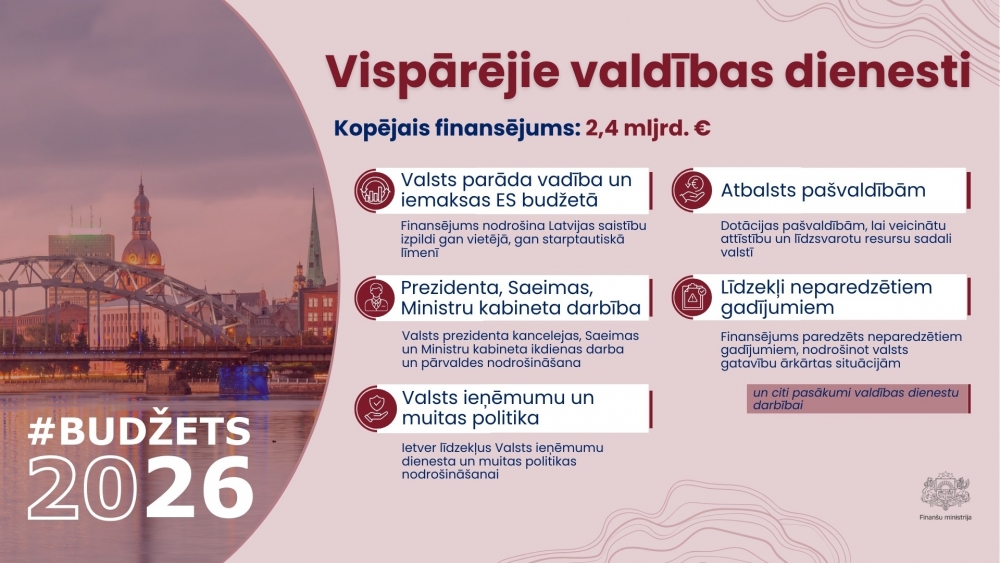 Valsts parāda vadībai paredzēti 578 miljoni eiro, tādējādi nodrošinot savlaicīgu saistību izpildi un valsts finanšu stabilitāti ilgtermiņā. Savukārt pārējā daļa vispārējo valdības dienestu finansējuma 2026. gadā sasniedz 1,4 miljardus eiro. Šajā apjomā ietilpst 744 miljoni eiro ES fondu un ārvalstu finanšu palīdzības līdzfinansētiem projektiem, nodrošinot valsts līdzdalību investīciju projektu īstenošanā. Savukārt 106 miljoni eiro paredzēti dotācijai pašvaldību finanšu izlīdzināšanas fondam, stiprinot pašvaldību fiskālo kapacitāti un pakalpojumu nodrošināšanu iedzīvotājiem.