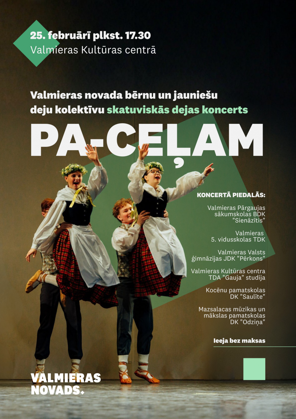 Koncertā piedalīsies Valmieras Pārgaujas sākumskolas bērnu deju kolektīvs “Sienāzītis”, Valmieras 5. vidusskolas tautas deju kolektīvs, Valmieras Valsts ģimnāzijas jauniešu deju kolektīvs “Pērkons”, Valmieras Kultūras centra tautas deju kolektīva “Gauja” studija, Kocēnu pamatskolas deju kolektīvs “Saulīte” un Mazsalacas Mūzikas un mākslas pamatskolas deju kolektīvs “Odziņa”.